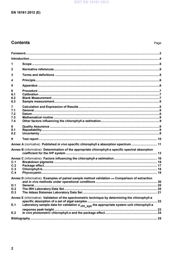 Validation of the spectrometric technique by determining the chlorophyll-a specific absorption of a set of algal samples . 22E.1Laboratory sample data for validation a*chl_sys the appropriate system unit chlorophyll-a response peak height . 22E.2In vivo photometric chlorophyll-a and the package effect . 24Bibliography . 25 SIST EN 16161:2013