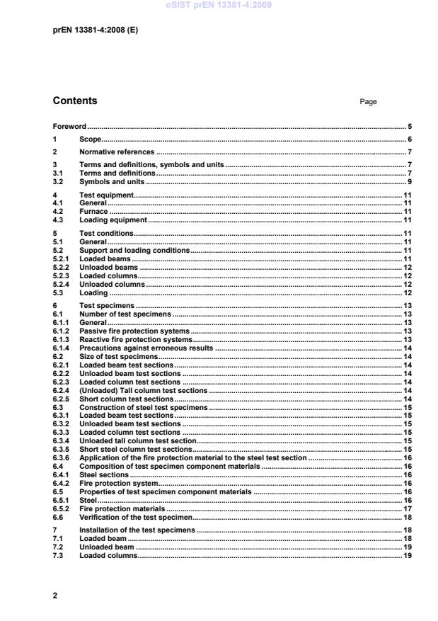 prEN 13381-4 (CEN draft) defines test methods for determining the contribution to the fire resistance of structural members when applied passive protection products are used on steel members. The document sets out furnace conditions, specimen preparation, instrumentation, test procedures, reporting and assessment approaches used to quantify how coatings, claddings and other passive systems affect steel member performance in fire.