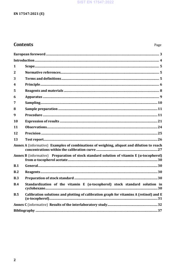 Ta evropski standard določa metodo za določevanje vsebnosti vitamina A (retinol), vitamina E (alfa tokoferol) in vitamina D (D2 ergokalciferol ali D3 holekalciferol) v krmi z ekstrakcijo na trdno fazo (SPE) in tekočinsko kromatografijo visoke ločljivosti (HPLC).