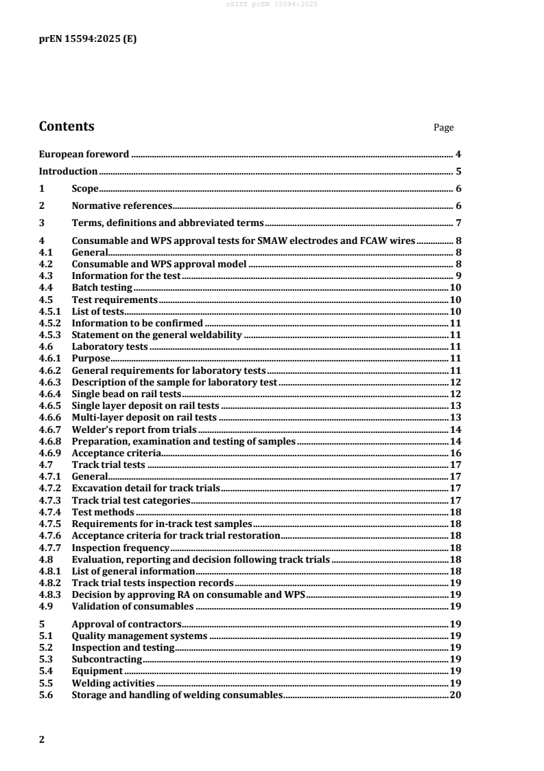 This document describes the approval systems for consumables and procedures used in manual metal arc and flux cored metal deposit rail repair welding. This document includes the quality-related tasks and responsibilities of personnel involved in the electric arc repair welding of rails. This document applies to plain rail and switches and crossings manufactured from new Vignole railway rails R200, R220, R260, R260Mn, and R350HT grades rails of 27 kg/m and above as contained in EN 13674-1, EN 13674-2 and EN 13674-4.