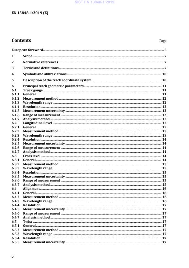 Key 1 low pass filtered value (mean) 2 twist 3 zero line Figure 9 — Twist – Analysis method 7 Measurement conditions In order to reproduce the dynamic effects of vehicles, all of the geometric parameters should preferably be measured on a loaded track, in which case, the applied loading at the measuring point of the rail shall be equivalent to a minimum vertical wheel load of 25 kN when considering a mean track stiffness of 90 kN/mm per rail (wheel load divided by rail deflection) and a rail profile 60E1. There can be differences in all track geometry parameter values according to whether they are measured in loaded or unloaded, or static or dynamic conditions. These differences should be taken into account when comparing measurements made under different conditions. In case of unloaded or static measurement conditions, such conditions shall be documented. The results of measurements shall be within the specified measurement precision for different speeds and for each direction of recording. If this is not the case, the domain of validity and/or the direction of travel shall be specified. All parameters shall be measured at the same location within the sampling distance specified. All principal parameters shall be measured at the same sampling distance. For signal processing and signal analysis reasons this sampling distance should not exceed 0,25 m. The localization uncertainty of all discrete measurements shall be within ± 10 m. The uncertainty of the sampling distance shall be within 1 ‰. SIST EN 13848-1:2019