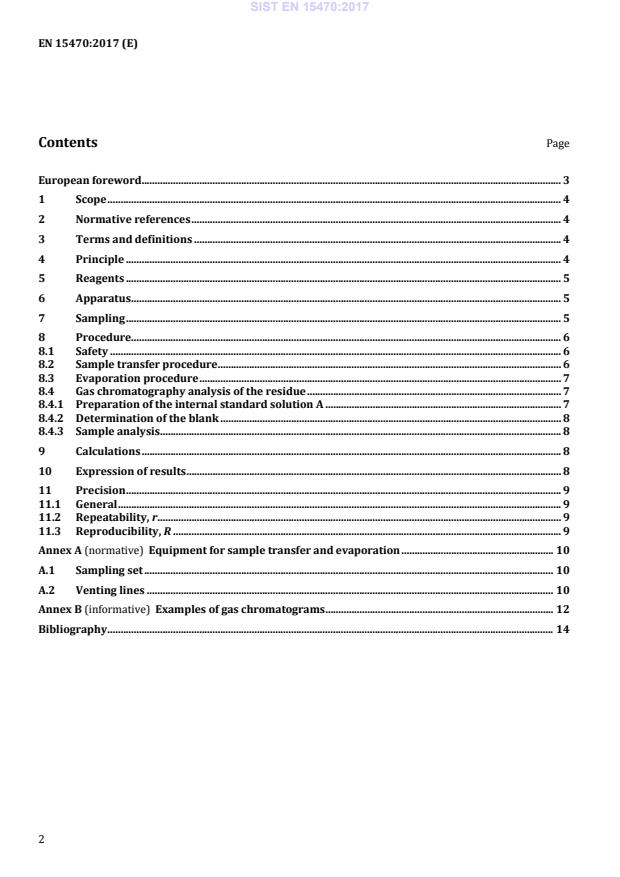 Ta evropski standard določa metodo za določevanje raztopljenih ostankov snovi v utekočinjenih naftnih plinih (LPG) v razponu 40–100 mg/kg. Višje koncentracije je mogoče določiti s prilagajanjem velikosti vzorca.