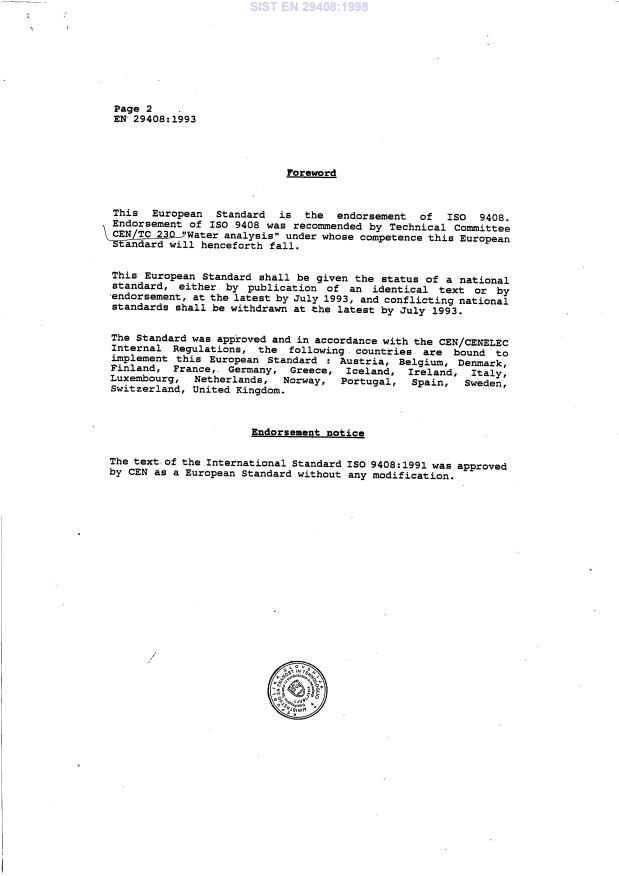 ISO 9408:1991(E) Foreword ISO (the International Organization for Standardization) is a worldwide federation of national Standards bodies (ISO member bodies). The work of preparing International Standards is normally carried out through ISO technical committees. Esch member body interested in a subject for which a technical committee has been established has the right to be represented on that committee. International organizations, govern- mental and non-governmental, in liaison with ISO, also take part in the work. ISO collaborates closely with the International Electrotechnical Commission (IEC) on all matters of electrotechnical standardization. Draft International Standards adopted by the technical committees are circulated to the member bodies for voting. Publication as an Inter- national Standard requires approval by at least 75 % of the member bodies casting a vote. International Standard ISO 9408 was prepared by Technical Committee ISO/TC 147, Water quality. Annexes A, 6, C and D of this International Standard are for information only. 0 ISO 1991 All rights reserved. No part of this publication may be reproduced or utilized in any form or by any means, electronie or mechanical, including photocopying and microfilm, without Permission in writing from the publisher. International Organization for Standardization Case Postale 56 l CH-1211 Geneve 20 l Switzerland Printed in Switzerland ii SIST EN 29408:1998
