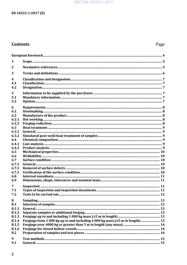 m in length) . 13 8.1.5 Forgings over 4000 kg or greater than 5 m in length (any mass) . 14 8.1.6 Forgings for closed hollow vessels. 14 8.2 Preparation of samples and test pieces . 14 9 Test methods . 15 9.1 General . 15 SIST EN 10222-1:2017