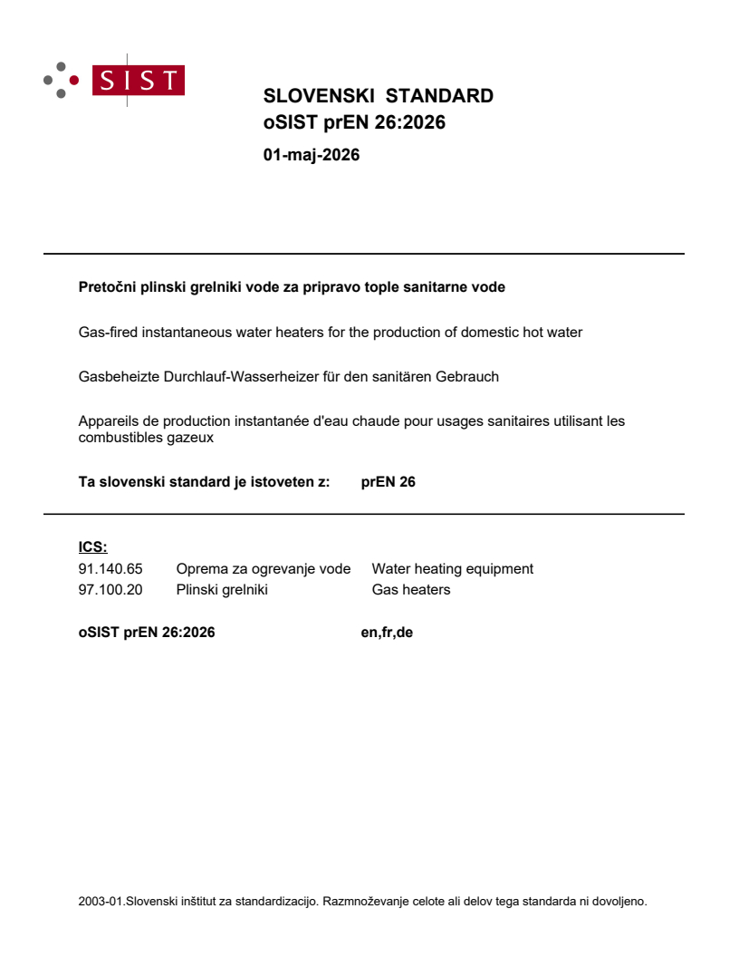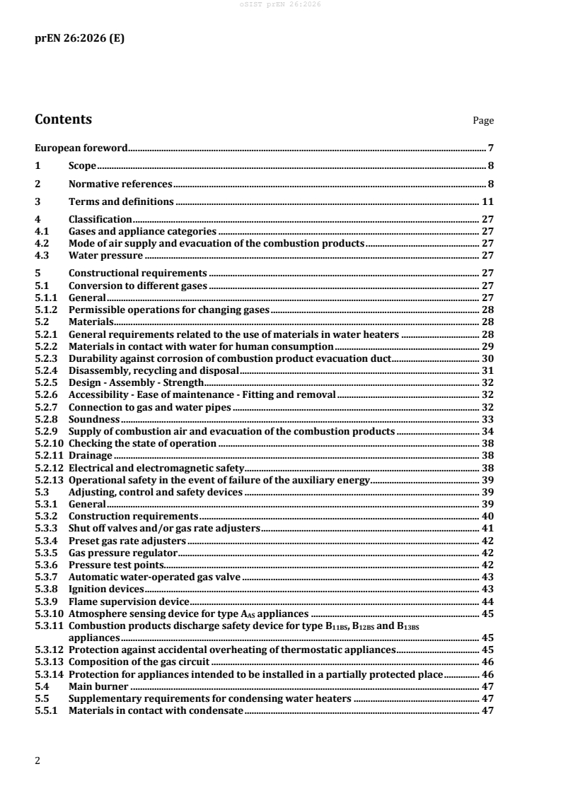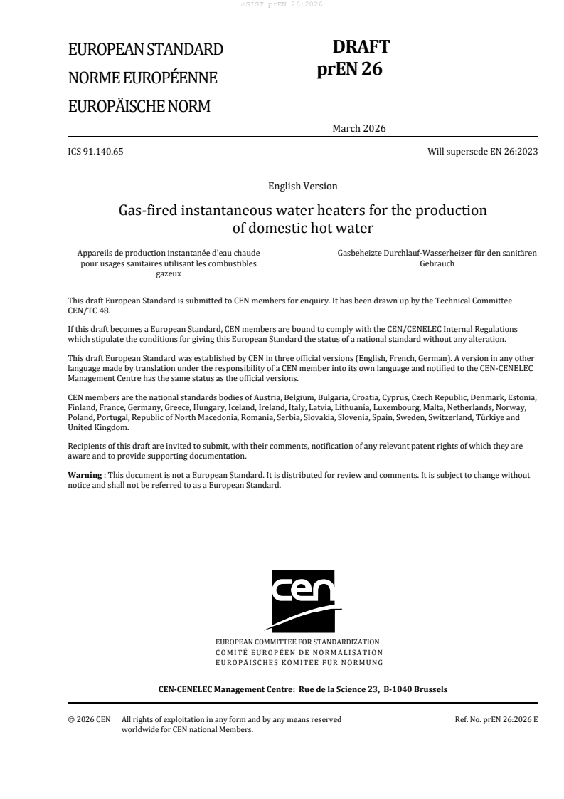 prEN 26:2026 is a draft European Standard developed by CEN/TC 48 for gas-fired instantaneous water heaters used for producing domestic hot water. The standard outlines specifications, classification, test methods, marking requirements, and energy labelling for gas-fired water heaters utilized in sanitary applications. It applies to appliances of types A, B, and C, according to their air supply and exhaust configurations, and for those running on various types of combustible gases as defined by the major gas families and relevant European standards.