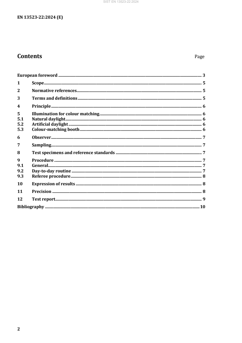 EN 13523-22:2024 - "Coil coated metals - Test methods - Part 22: Colour difference - Visual comparison" (CEN) defines a standardized, qualitative procedure for visually assessing colour differences of organic coatings on metallic substrates. The method uses either diffuse natural daylight or artificial daylight (CIE D65 equivalent) in a colour‑matching booth to compare a test specimen against a reference standard. Results are descriptive (acceptable / not acceptable and directional colour notes) rather than numerical - this procedure is intended where instrumental measurement is not recommended (e.g., metallic colours, routine colour inspections).
