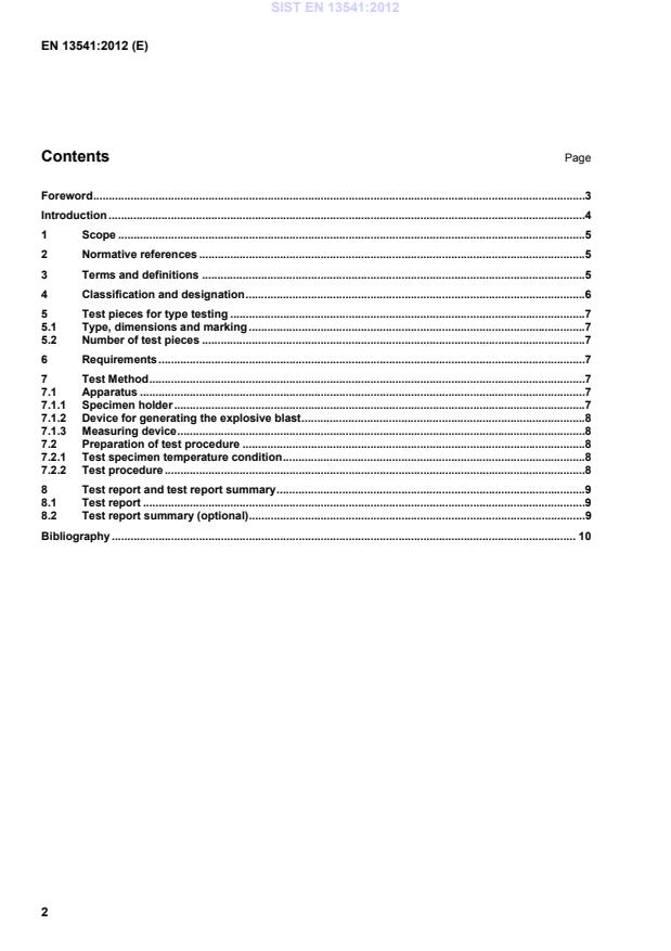 Ta evropski standard določa preskusno metodo, zahtevane lastnosti in razvrščanje za zasteklitev, odporno proti zvočnemu tlaku pri eksploziji v gradbeništvu. Zasteklitev, odporna proti zvočnemu tlaku pri eksploziji, je namenjena zagotavljanju odpornosti proti eksplozijam, da se zagotovi varnost ljudi. Ta evropski standard zajema preskusno metodo za ugotavljanje odpornosti proti udarnim valovom, ki nastanejo pri uporabi detonacijskih cevi ali podobnih naprav za simulacijo izjemno eksplozivne detonacije. Klasifikacija je veljavna le za preskušene velikosti stekla s površino približno m2. Rezultati se lahko na podlagi teoretičnih predpostavk in/ali poskusov uporabljajo za oceno odpornosti stekla drugih velikosti proti zvočnemu tlaku pri eksploziji.
