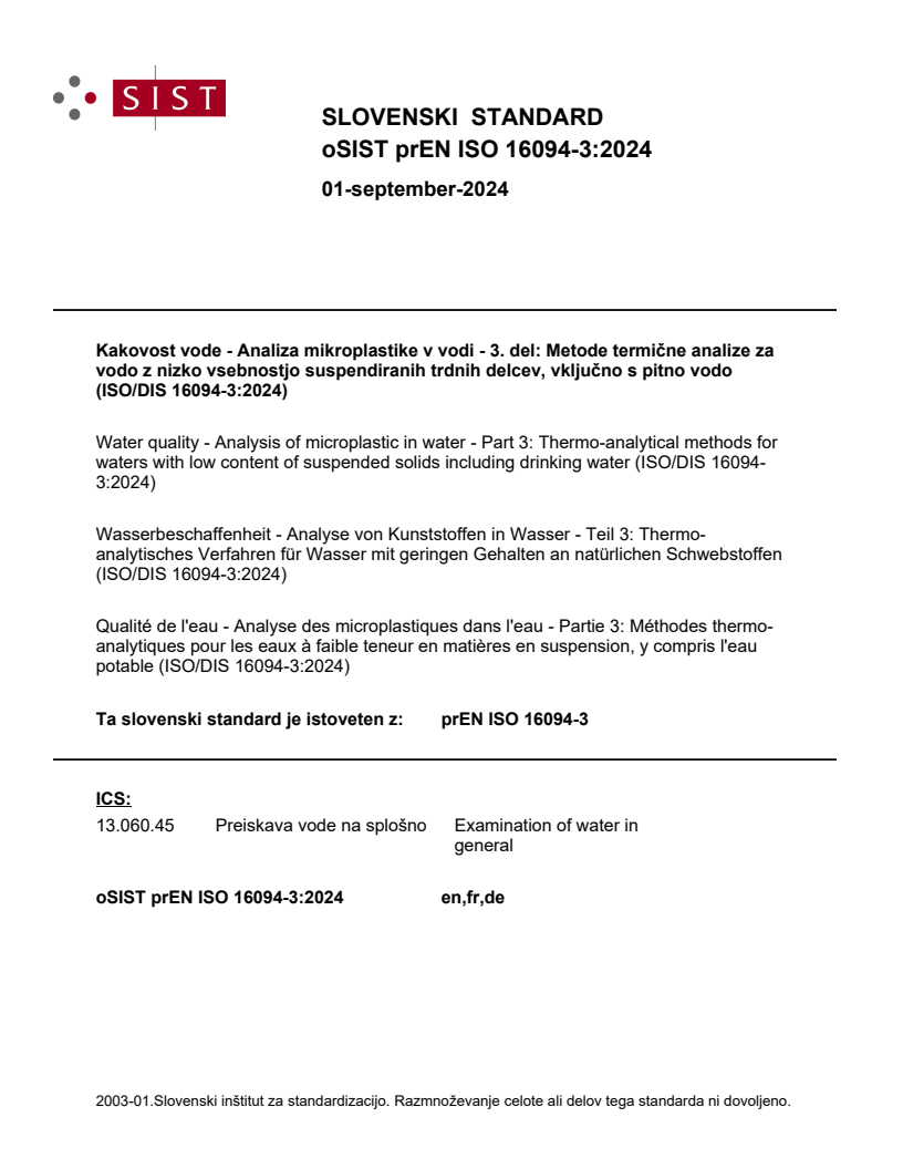 Water quality - Analysis of microplastic in water - Part 3: Thermo-analytical methods for waters with low content of suspended solids including drinking water (ISO/DIS 16094-3:2024)