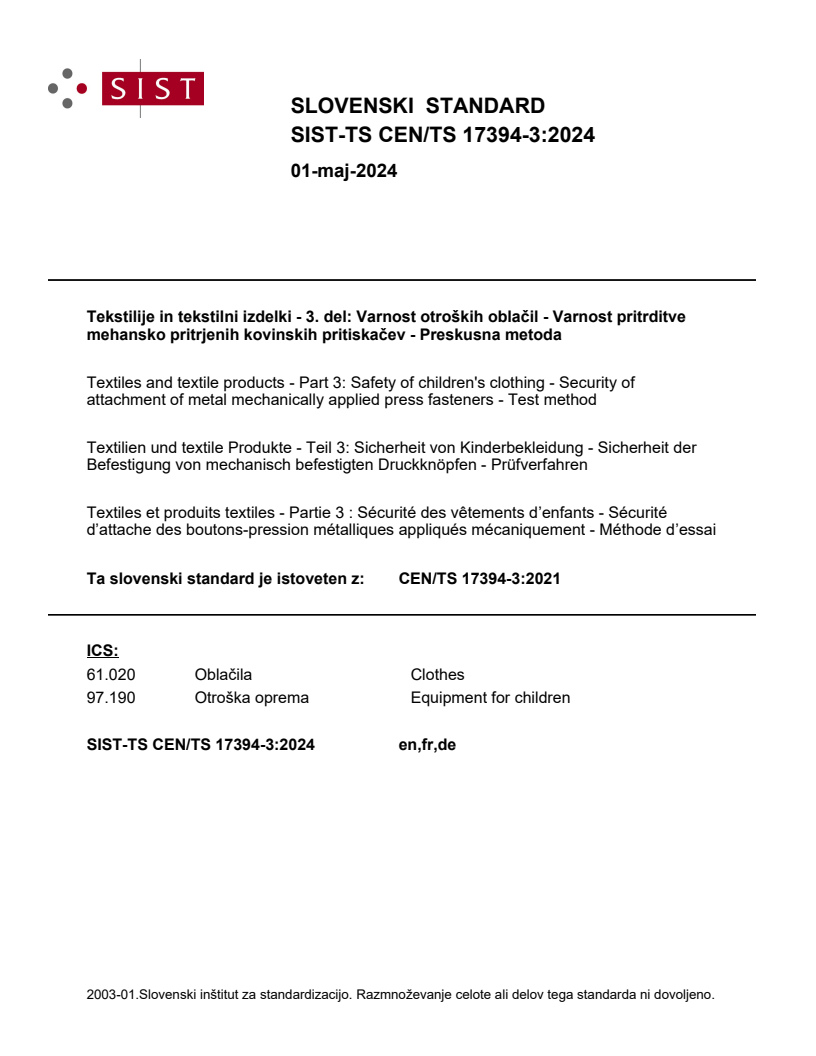 CEN/TS 17394-3:2021 - Textiles and textile products - Part 3: Safety of children's clothing - Security of attachment of metal mechanically applied press fasteners - Test method