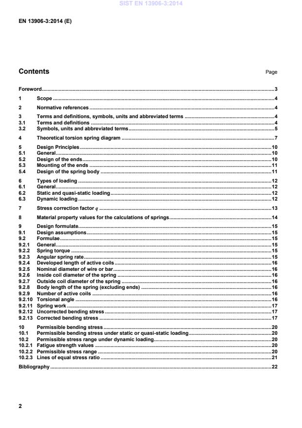 ≥ 2 Spring index 4 ≤ w ≤ 20 4 ≤ w ≤ 12 a The user of this European Standard shall pay attention to the design of hot coiled springs, because there can be differences between the design and a real test. 2 Normative references The following documents, in whole or in part, are normatively referenced in this document and are indispensable for its application. For dated references, only the edition cited applies. For undated references, the latest edition of the referenced document (including any amendments) applies. EN 10089, Hot-rolled steels for quenched and tempered springs - Technical delivery conditions EN 10270-1, Steel wire for mechanical springs - Part 1: Patented cold drawn unalloyed spring steel wire EN 10270-2, Steel wire for mechanical springs - Part 2: Oil hardened and tempered spring steel wire EN 10270-3, Steel wire for mechanical springs - Part 3: Stainless spring steel wire EN 12166, Copper and copper alloys - Wire for general purposes EN ISO 26909:2010, Springs - Vocabulary (ISO 26909:2009) ISO 26910-1, Springs - Shot peening - Part 1: General procedures 3 Terms and definitions, symbols, units and abbreviated terms 3.1 Terms and definitions For the purposes of this document, the terms and definitions given in EN ISO 26909:2010 and the following apply. 3.1.1 spring mechanical device designed to store energy when deflected and to return the equivalent amount of energy when released [SOURCE: EN ISO 26909:2010, 1.1] 3.1.2 torsion spring spring that offers resistance to a twisting moment around the longitudinal axis of the spring [SOURCE: EN ISO 26909:2010, 1.4] SIST EN 13906-3:2014
