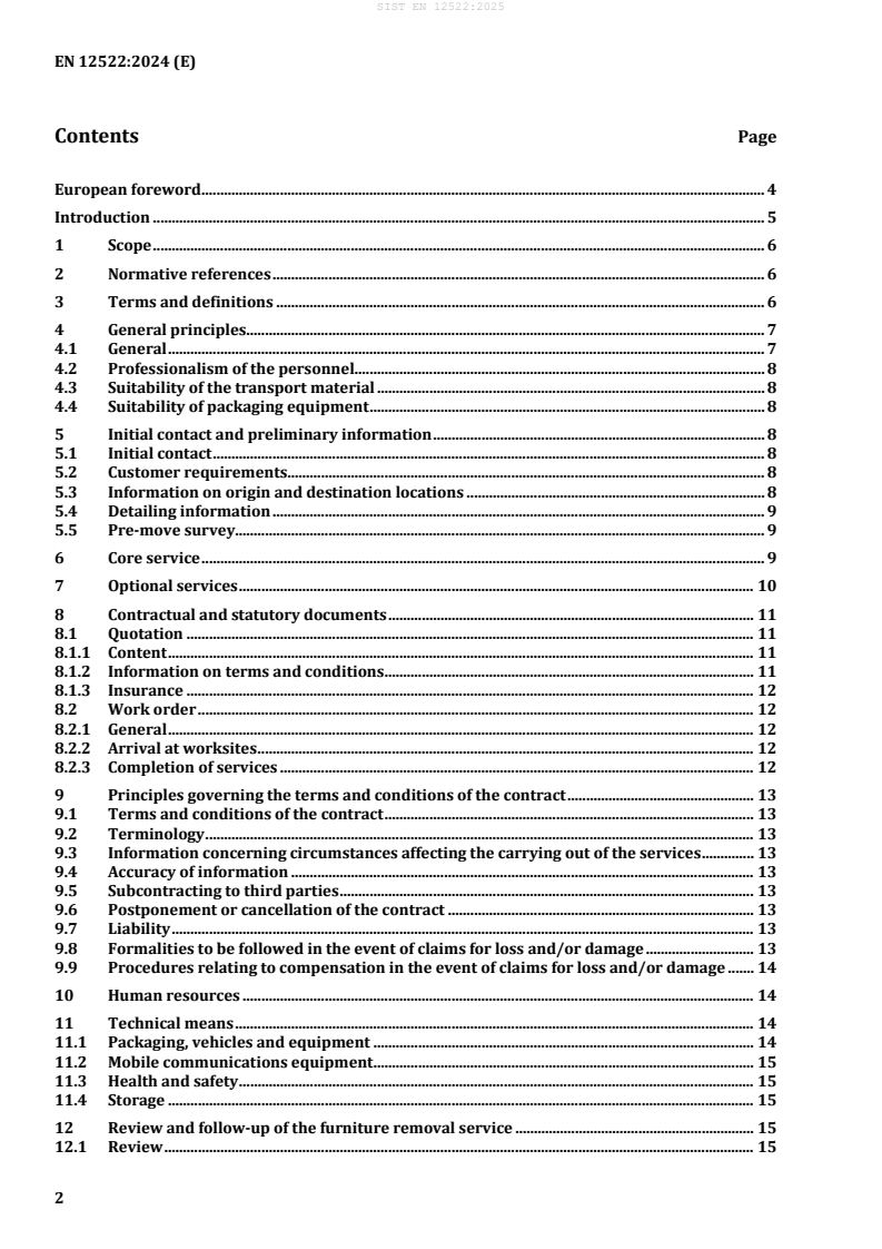 EN 12522:2024 - Furniture removal activities - Furniture removal for private individuals - Service specification (CEN) defines a common specification for furniture removal services provided to private customers. The standard covers the full service chain from initial contact and pre-move survey through quotation, contracting, execution (packing, loading, transport, unloading), optional services, storage, insurance, complaint handling and quality management. It applies to moves of non-commercial, in‑use personal property where the contract is entered into by an individual or by an employer/relocation agent acting for a private individual.