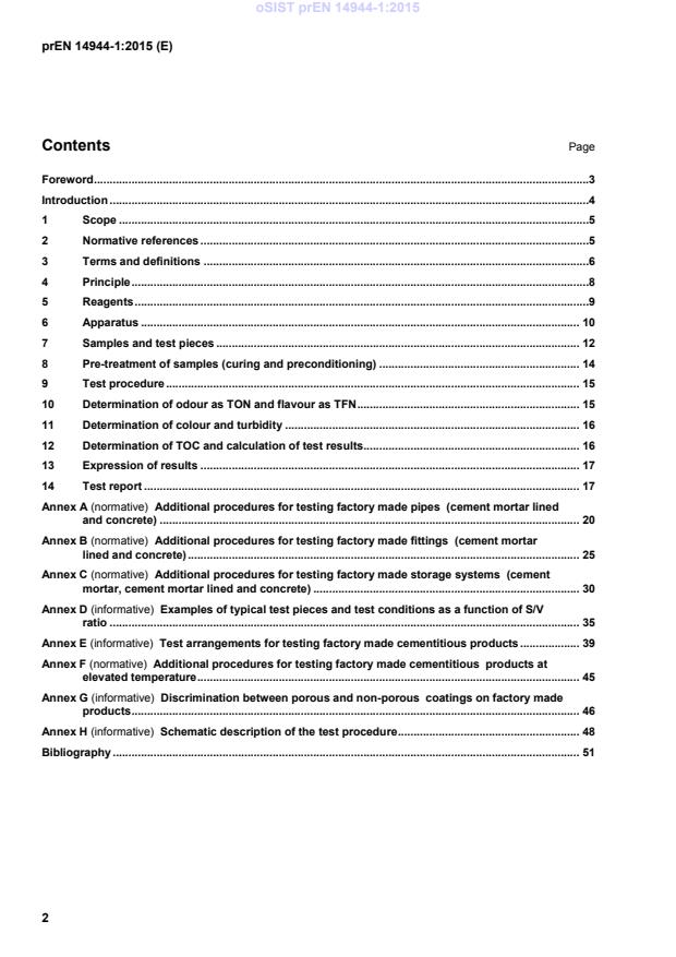 prEN 14944-1 rev - a CEN draft for EN 14944-1 - specifies a laboratory test method to assess the influence of factory made cementitious products on water intended for human consumption. The standard covers migration testing that evaluates changes in organoleptic parameters (odour, flavour), colour, turbidity and total organic carbon (TOC) of test waters after contact with cement mortar linings, concrete pipes, tanks and similar products used for transport and storage of drinking water.