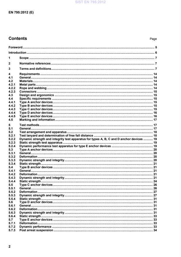 EN 795:2012 is a standard published by the European Committee for Standardization (CEN). Its full title is "Personal fall protection equipment - Anchor devices". This standard covers: This European Standard specifies requirements for performance and associated test methods for single-user anchor devices which are intended to be removable from the structure. These anchor devices incorporate stationary or travelling (mobile) anchor points designed for the attachment of components of a personal fall protection system in accordance with EN 363. This European Standard also gives requirements for marking and instructions for use, and guidance on installation. This European Standard is not applicable to: - anchor devices intended to allow more than one user to be attached at any one time; - anchor devices used in any sports or recreational activity; - equipment designed to conform to EN 516 or EN 517; - elements or parts of structures which were installed for use other than as anchor points or anchor devices, e.g. beams, girders; - structural anchors (see 3.3).