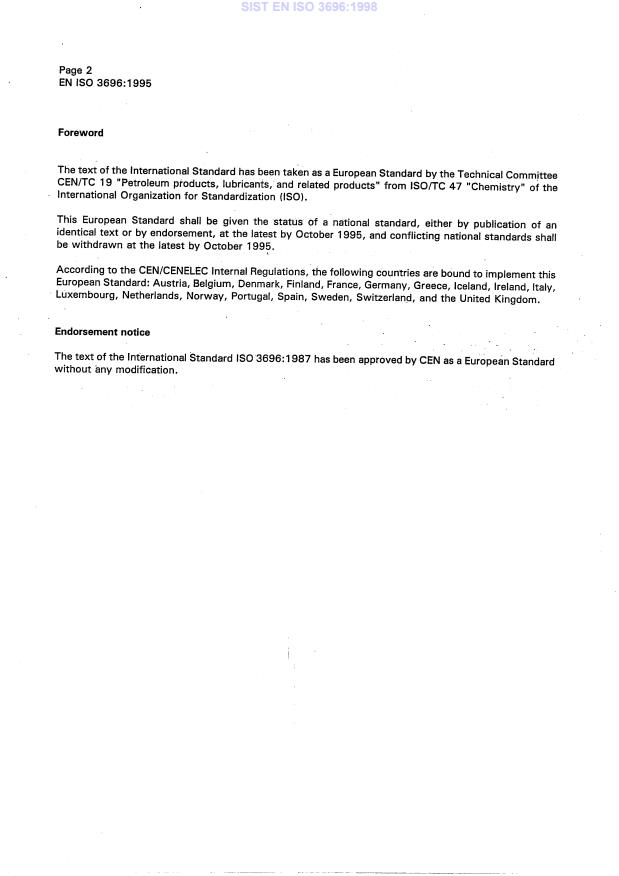 - This document is the EN-adopted version of ISO 3696:1987 (EN ISO 3696:1995). Users should consult the latest editions or amendments and consider additional tests where sterility, pyrogen‑free status or specific surface tension requirements are needed.