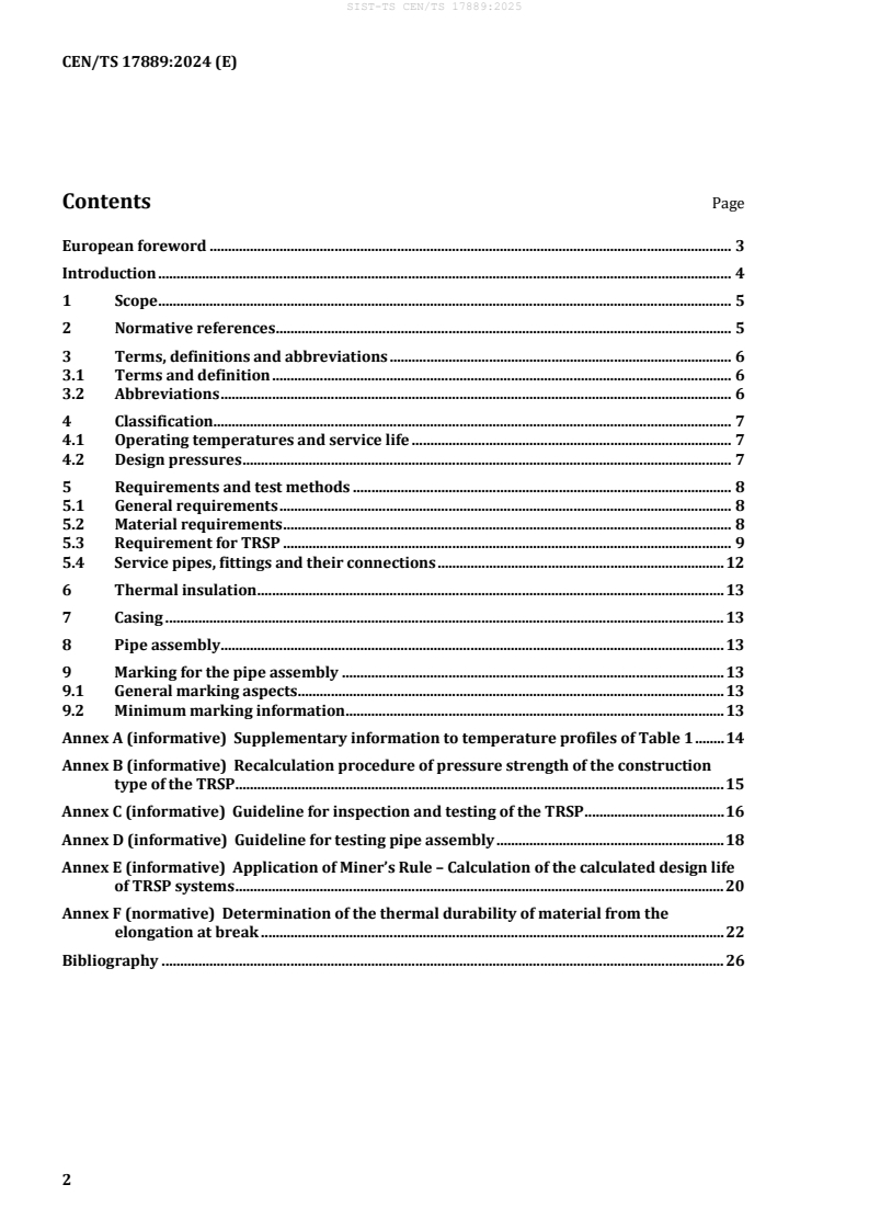 Keywords: district heating pipes, flexible pipe systems, TRSP, thermoplastic reinforced service pipes, bonded, PE‑Xa, para‑aramid, design pressure, 115 °C, 30-year service life, CEN/TS 17889.