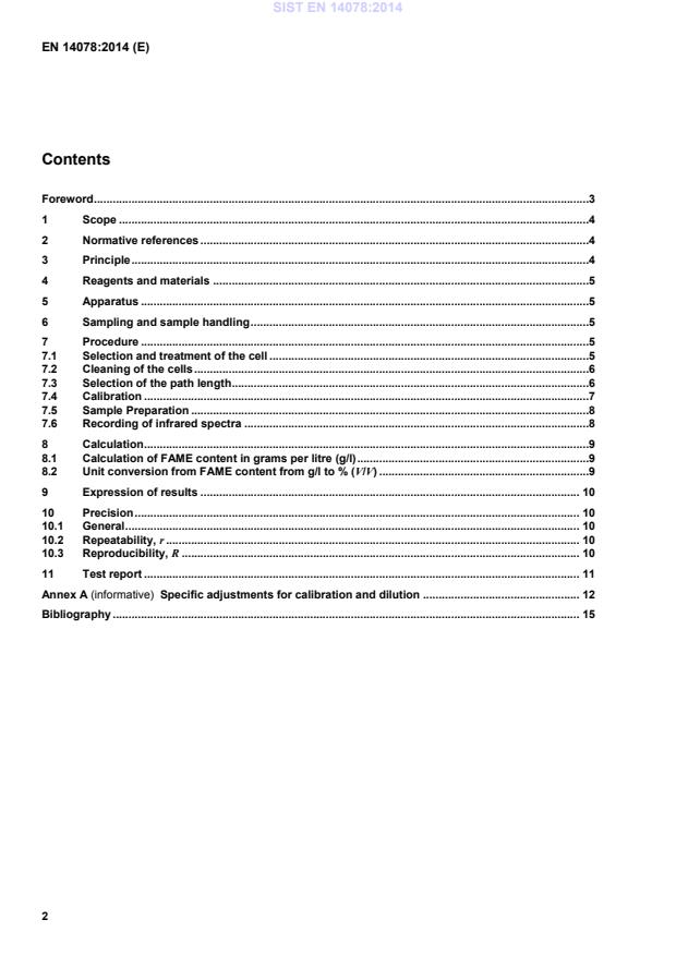 Standard EN 14078 opredeljuje preskusno metodo za določanje vsebnosti metilnih estrov maščobnih kislin (FAME) v dizelskem gorivu ali gorivih za ogrevanje v gospodinjstvih z metodo srednje infrardeče spektroskopije, ki se nanaša na vsebnost metilnih estrov maščobnih kislin dveh razponov merjenja: - razpon A: za vsebnost metilnih estrov maščobnih kislin v razponu od pribl. 0,05 % (V/V) do pribl. 3 % (V/V); - razpon B: za vsebnost metilnih estrov maščobnih kislin v razponu od pribl. 3 % (V/V) do pribl. 20 % (V/V); - razpon C: za vsebnost metilnih estrov maščobnih kislin od pribl. 20 % (V/V) do pribl. 50 % (V/V). Načeloma je možno analizirati tudi višje vsebnosti metilnih estrov maščobnih kislin, če so razredčene; vendar pa trenutno ni na voljo natančnih podatkov za rezultate izven opredeljenega razpona. Ta preskusna metoda je bila potrjena, da se lahko uporablja za vzorce, ki vsebujejo metilne estre maščobnih kislin, v skladu z EN 14214 ali EN 14213. Zanesljive kvantitativne rezultate je mogoče dobiti le, če vzorci ne vsebujejo znatnih količin drugih motečih sestavin, zlasti estrov in drugih karbonilnih spojin, ki imajo absorpcijske pasove v spektralnem območju, ki se uporablja za količinsko določitev metilnih estrov maščobnih kislin. Če so take moteče snovi prisotne, se pričakuje, da bodo vrednosti, pridobljene s to preskusno metodo, višje.