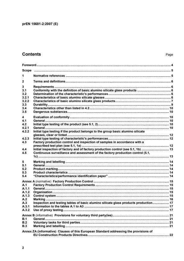 prEN 15681-2 - "Glass in building - Basic alumino silicate glass products - Part 2: Evaluation of conformity/Product standard" (CEN draft, 2007) defines how manufacturers evaluate conformity and manage factory production control for basic alumino silicate glass used in buildings. It focuses on ensuring declared performance characteristics, durability during an economically reasonable working life, and the information and marking needed for regulatory compliance (including provisions related to the EU Construction Products Directive and CE marking).