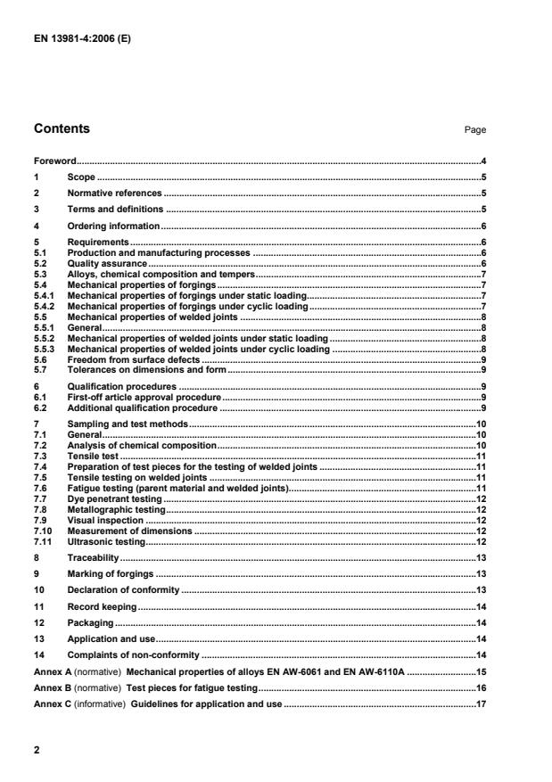 Tables Table 1 — Fatigue properties of forgings (not applicable for design purposes, see C.2).7 Table 2 — Fatigue properties of MIG welded butt joints (not applicable for design purposes, see C.2).9 Table 3 — Product inspection and testing procedures.10 Table 4 — Fatigue test factor F.12 Table A.1 — Mechanical properties of alloy EN AW-6061 and EN AW-6110A forgings.15 Table B.1 — Dimensions of test pieces.16 Table C.1 — Mechanical properties of welded butt joints, EN ISO 10042 class C, MIG welded.19 Table D.1 — Chemical composition of alloy EN AW-6110A.20