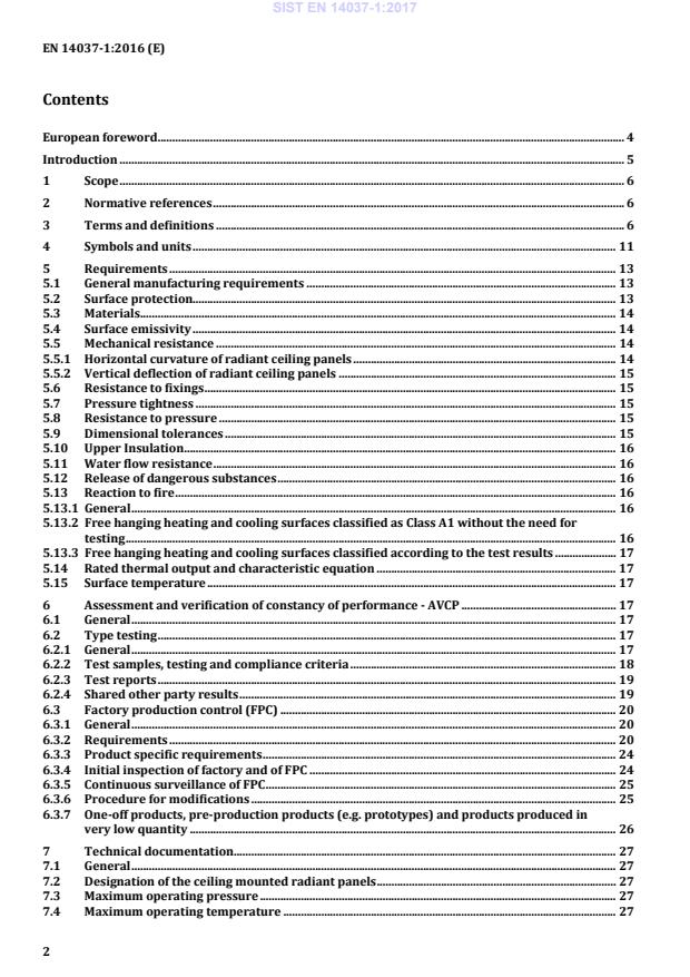 2 Contents European foreword . 4 Introduction . 5 1 Scope . 6 2 Normative references . 6 3 Terms and definitions . 6 4 Symbols and units . 11 5 Requirements . 13 5.1 General manufacturing requirements . 13 5.2 Surface protection. 13 5.3 Materials . 14 5.4 Surface emissivity . 14 5.5 Mechanical resistance . 14 5.5.1 Horizontal curvature of radiant ceiling panels . 14 5.5.2 Vertical deflection of radiant ceiling panels . 15 5.6 Resistance to fixings . 15 5.7 Pressure tightness . 15 5.8 Resistance to pressure . 15 5.9 Dimensional tolerances . 15 5.10 Upper Insulation . 16 5.11 Water flow resistance . 16 5.12 Release of dangerous substances . 16 5.13 Reaction to fire . 16 5.13.1 General . 16 5.13.2 Free hanging heating and cooling surfaces classified as Class A1 without the need for testing . 16 5.13.3 Free hanging heating and cooling surfaces classified according to the test results . 17 5.14 Rated thermal output and characteristic equation . 17 5.15 Surface temperature . 17 6 Assessment and verification of constancy of performance - AVCP . 17 6.1 General . 17 6.2 Type testing . 17 6.2.1 General . 17 6.2.2 Test samples, testing and compliance criteria . 18 6.2.3 Test reports . 19 6.2.4 Shared other party results . 19 6.3 Factory production control (FPC) . 20 6.3.1 General . 20 6.3.2 Requirements . 20 6.3.3 Product specific requirements . 24 6.3.4 Initial inspection of factory and of FPC . 24 6.3.5 Continuous surveillance of FPC . 25 6.3.6 Procedure for modifications . 25 6.3.7 One-off products, pre-production products (e.g. prototypes) and products produced in very low quantity . 26 7 Technical documentation . 27 7.1 General . 27 7.2 Designation of the ceiling mounted radiant panels . 27 7.3 Maximum operating pressure . 27 7.4 Maximum operating temperature . 27 SIST EN 14037-1:2017