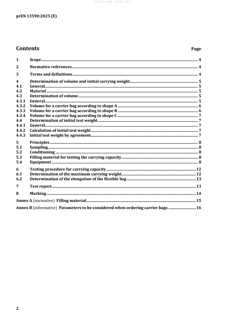 prEN 13590 is a draft published by the European Committee for Standardization (CEN). Its full title is "Packaging - Flexible carrier bags for the transport of various retail goods - General characteristics and test methods for the determination of volume and carrying capacity". This standard covers: This document specifies general characteristics and test methods for determination of volume and carrying capacity of flexible carrier bags with handles for transport of various unspecified retail goods. This document is applicable to: - carrier bags made of paper, thermoplastic material and/or any other flexible material; - carrier bags with any shape and dimension; - carrier bags with or without gussets.