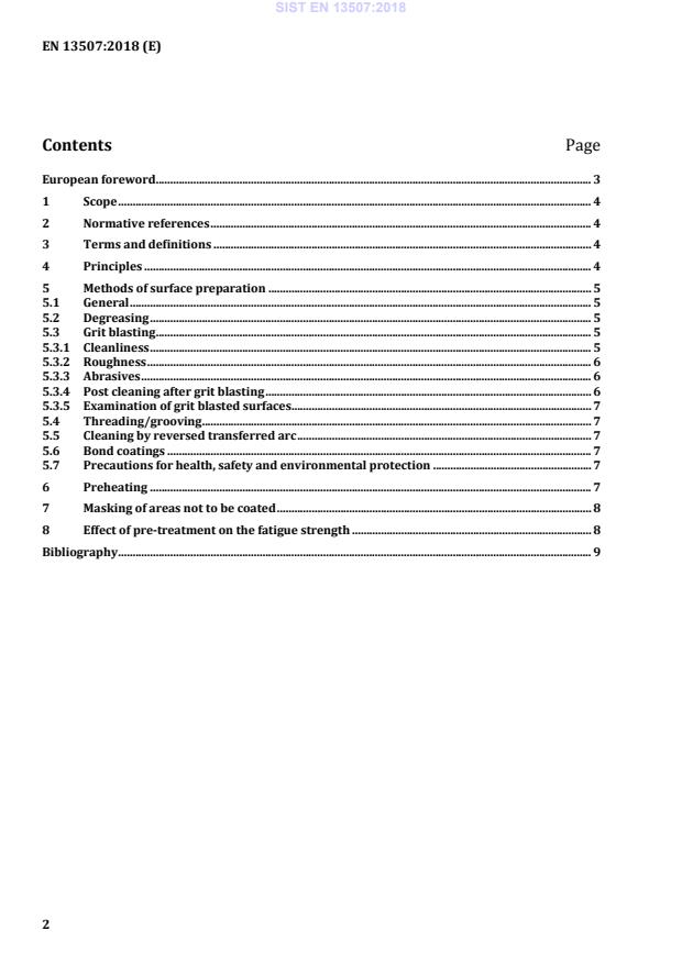 ISO Online browsing platform: available at http://www.iso.org/obp 4 Principles The surface preparation of a work piece has a substantial effect on the quality of the sprayed coating especially with regard to its adhesion to the substrate. To achieve a sufficient adhesive strength the metallic surface shall be processed until a technically clean interface is generated. The surface to be prepared shall be accessible for grit blasting. EN 15520 gives information regarding suitable component design. Welding splashes and residues of welding slag shall be removed, and weld seams and brazed or soldered joints shall be prepared with particular accuracy. Oxides, oil, grease and other contamination shall be removed. SIST EN 13507:2018