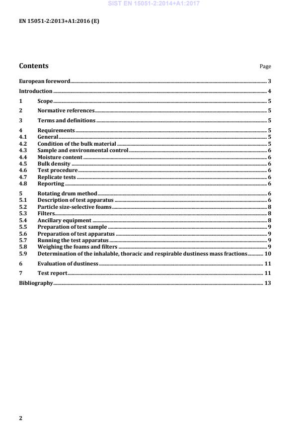This European Standard specifies the rotating drum test apparatus and associated test method for the reproducible production of dust from a bulk material under standard conditions, and the measurement of the inhalable, thoracic and respirable fractions of this dust, with reference to existing European Standards, where relevant (see Clause 6). This method is suitable for general bulk material handling processes, including all those processes where the bulk material is dropped, or can be dropped. It differs from the continuous drop method presented in EN 15051 3 in this European Standard, the same bulk material is repeatedly dropped, while in EN 15051 3, the bulk material is dropped only once, but continuously. Furthermore, this European Standard specifies the environmental conditions, the sample handling and analytical procedures, and the method of calculating and presenting the results. A classification scheme for dustiness is specified, to provide a standardised way to express and communicate the results to users of the bulk materials. This European Standard is applicable to powdered, granular or pelletised bulk materials. A standard sample volume is used. This European Standard is not applicable to test the dust released when solid bulk materials are mechanically reduced (e.g. cut, crushed) or to evaluate handling procedures for the bulk materials.