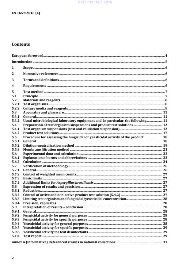 2003-01.Slovenski inštitut za standardizacijo. Razmnoževanje celote ali delov tega standarda ni dovoljeno.Chemische Desinfektionsmittel und Antiseptika - Quantitativer Suspensionsversuch zur Bestimmung der fungiziden oder levuroziden Wirkung chemischer Desinfektionsmittel und Antiseptika für den Veterinärbereich - Prüfverfahren und Anforderungen (Phase 2, Stufe 1)Antiseptiques et désinfectants chimiques - Essai quantitatif de suspension pour l'évaluation de l'activité fongicide ou levuricide des antiseptiques et des désinfectants chimiques utilisés dans le domaine vétérinaire - Méthode d'essai et prescriptions (phase 2, étape 1)Chemical disinfectants and antiseptics - Quantitative suspension test for the evaluation of fungicidal or yeasticidal activity of chemical disinfectants and antiseptics used in the veterinary area - Test method and requirements (phase 2, step 1)11.220VeterinarstvoVeterinary medicine11.080.20Dezinfektanti in antiseptikiDisinfectants and antisepticsICS:Ta slovenski standard je istoveten z:EN 1657:2016SIST EN 1657:2016en,fr,de01-november-2016SIST EN 1657:2016SLOVENSKI