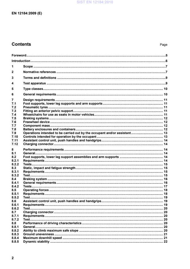 1 Scope This European Standard specifies requirements and test methods for electrically powered wheelchairs with a maximum speed not exceeding 15 km/h intended to carry one person of mass not greater than 100 kg, which includes: manual wheelchairs with add-on power kits used for propulsion, electrically powered wheelchairs, and electrically powered scooters with three or more wheels. It also specifies requirements and test methods for battery chargers for wheelchairs and scooters. This European Standard does not apply in total to: wheelchairs intended for special purposes, such as sports, custom-made wheelchairs, handrim activated power assisted wheelchairs and powered office chairs. NOTE 1 The application of this standard is limited to wheelchairs with a maximum occupant mass of 100 kg because the maximum mass of dummy specified in ISO 7176-11:1992 is 100 kg. Annex A (informative) provides guidance for construction of dummies of mass 125 kg and 150 kg. At the time of publication, a new edition of ISO 7176-11 was under development, including test dummies with masses above 100 kg. NOTE 2 Requirements for manually propelled wheelchairs are specified in EN 12183. 2 Normative references The following referenced documents are indispensable for the application of this document. For dated references, only the edition cited applies. For undated references, the latest edition of the referenced document (including any amendments) applies. EN 1021-1:2006, Furniture — Assessment of the ignitability of upholstered furniture — Part 1: Ignition source smouldering cigarette EN 1021-2:2006, Furniture — Assessment of the ignitability of upholstered furniture — Part 2: Ignition source match flame equivalent EN 12182, Technical aids for disabled persons — General requirements and test methods EN 50272-3:2002, Safety requirements for secondary batteries and battery installations — Part 3: Traction batteries EN 60335-1:2002, Household and similar electrical appliances — Safety — Part 1: General requirements (IEC 60335-1:2001, modified) EN 60529:1991, Degrees of protection provided by enclosures (IP code) (IEC 60529:1989) SIST EN 12184:2010