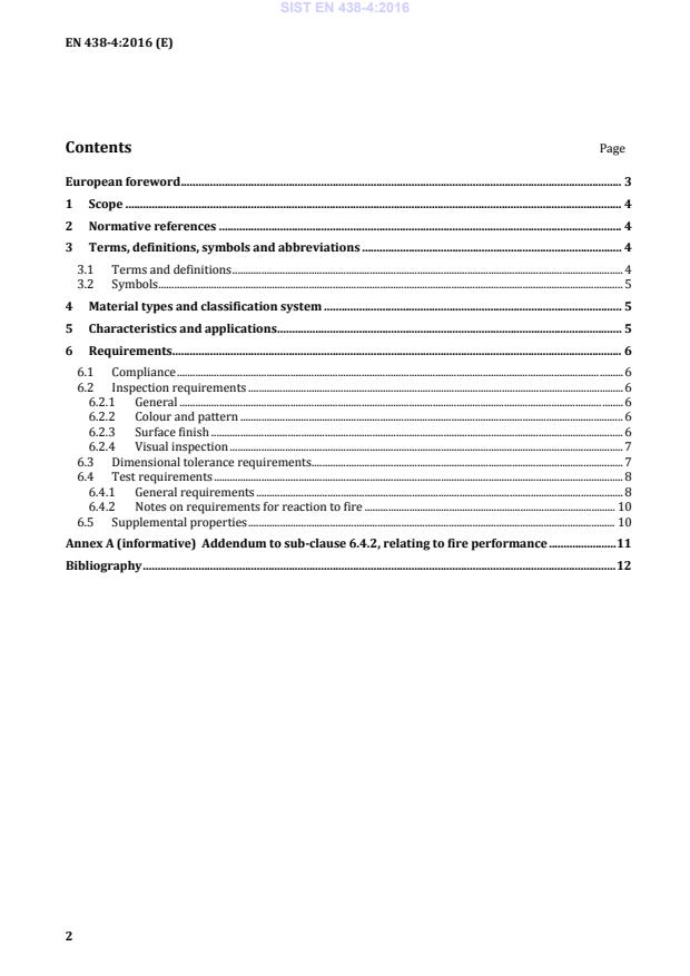 Page European foreword . 3 1 Scope . 4 2 Normative references . 4 3 Terms, definitions, symbols and abbreviations . 4 3.1 Terms and definitions . 4 3.2 Symbols . 5 4 Material types and classification system . 5 5 Characteristics and applications . 5 6 Requirements . 6 6.1 Compliance . 6 6.2 Inspection requirements . 6 6.2.1 General . 6 6.2.2 Colour and pattern . 6 6.2.3 Surface finish . 6 6.2.4 Visual inspection . 7 6.3 Dimensional tolerance requirements . 7 6.4 Test requirements . 8 6.4.1 General requirements . 8 6.4.2 Notes on requirements for reaction to fire . 10 6.5 Supplemental properties . 10 Annex A (informative)