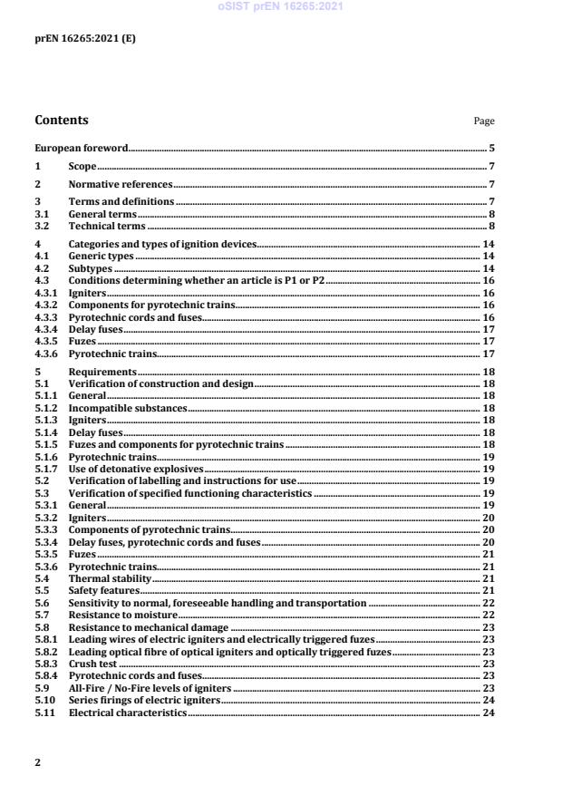 prEN 16265 (CEN draft, May 2021) is a European standard covering pyrotechnic ignition devices (excluding ignition devices for vehicles and safety fuses regulated under Directive 2014/28/EU). The document defines terms and sets out requirements for categorization, construction, testing, labelling and instructions for use for generic types such as: