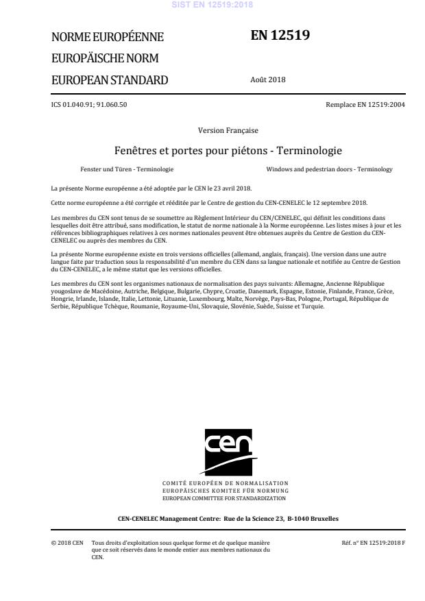 EN 12519:2018 is a standard published by the European Committee for Standardization (CEN). Its full title is "Windows and pedestrian doors - Terminology". This standard covers: This document specifies general terminology for windows and pedestrian doors. The various terms are illustrated with the aid of figures.