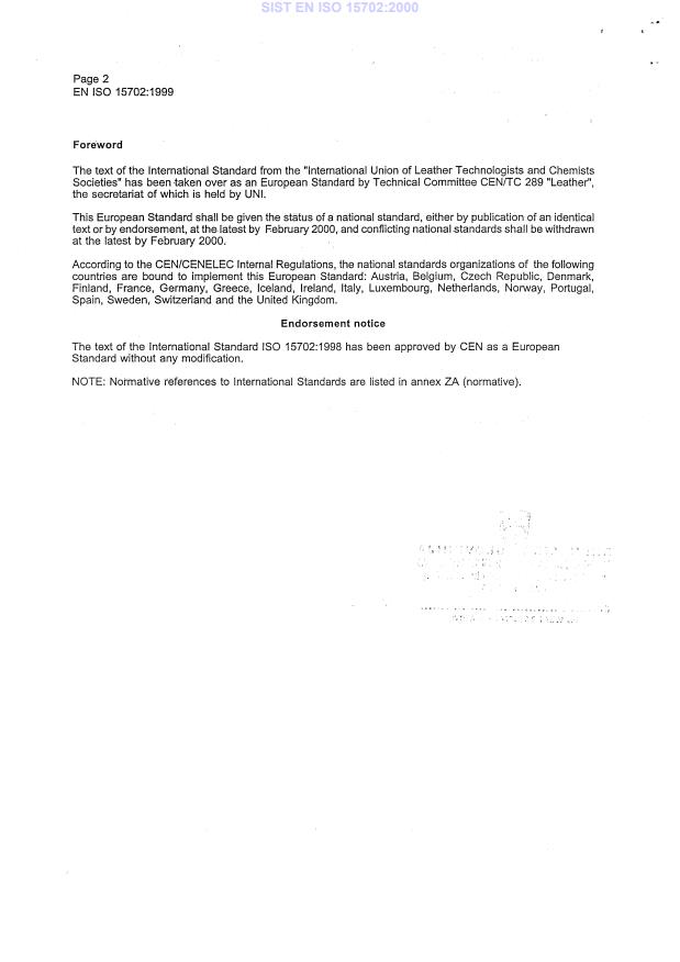 EN ISO 15702:1999 is a standard published by the European Committee for Standardization (CEN). Its full title is "Leather - Tests for colour fastness - Colour fastness to machine washing (ISO 15702:1998)". This standard covers: Migrated from Progress Sheet (TC Comment) (2000-07-10): WIs 056 to 060 are the result of the splitting of WI 021 (TC Res 10/1996)