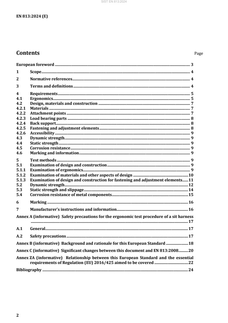 EN 813:2024 is a standard published by the European Committee for Standardization (CEN). Its full title is "Personal fall protection equipment - Sit harnesses". This standard covers: This European Standard specifies requirements, testing, marking and manufacturer’s instructions and information for sit harnesses to be used in restraint, work positioning and rope access systems, where a low point of attachment is required. Sit harnesses are not suitable to be used for fall arrest purposes.