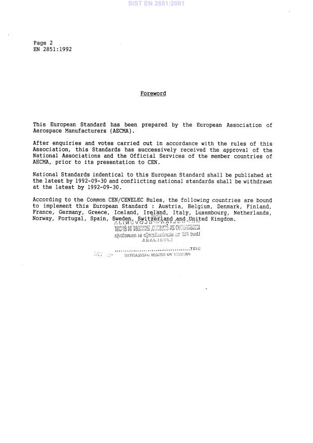 EN 2851:1992 - "Aerospace series - Marking of parts and assemblies other than engines - Indications on drawings" is a CEN standard that defines the method for indicating, on engineering drawings, the instructions required for marking of parts and assemblies used in aerospace applications. The standard applies to aerospace drawings except those for engines. EN 2851:1992 was later adopted by the Slovenian Institute for Standardization as SIST EN 2851:2001.