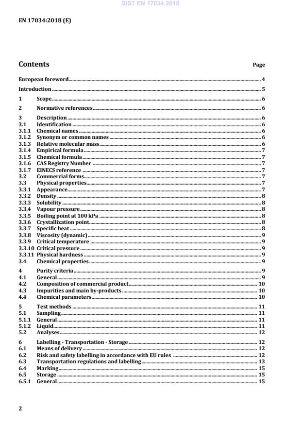 ............................................................................................................................................ 7 3.2 Commercial forms ........................................................................................................................................... 7 3.3 Physical properties ......................................................................................................................................... 7 3.3.1 Appearance ........................................................................................................................................................ 7 3.3.2 Density ................................................................................................................................................................ 8 3.3.3 Solubility ............................................................................................................................................................ 8 3.3.4 Vapour pressure .............................................................................................................................................. 8 3.3.5 Boiling point at 100 kPa ............................................................................................................................... 8 3.3.6 Crystallization point ....................................................................................................................................... 8 3.3.7 Specific heat ...................................................................................................................................................... 8 3.3.8 Viscosity (dynamic) ........................................................................................................................................ 9 3.3.9 Critical temperature ...................................................................................................................................... 9 3.3.10 Critical pressure .............................................................................................................................................. 9 3.3.11 Physical hardness ........................................................................................................................................... 9 3.4 Chemical properties ....................................................................................................................................... 9 4 Purity criteria ................................................................................................................................................... 9 4.1 General ................................................................................................................................................................ 9 4.2 Composition of commercial product ..................................................................................................... 10 4.3 Impurities and main by-products .......................................................................................................... 10 4.4 Chemical parameters .................................................................................................................................. 10 5 Test methods ................................................................................................................................................. 11 5.1 Sampling .......................................................................................................................................................... 11 5.1.1 General ............................................................................................................................................................. 11 5.1.2 Liquid ................................................................................................................................................................ 11 5.2 Analyses ........................................................................................................................................................... 12 6 Labelling - Transportation - Storage ..................................................................................................... 12 6.1 Means of delivery ......................................................................................................................................... 12 6.2 Risk and safety labelling in accordance with EU rules