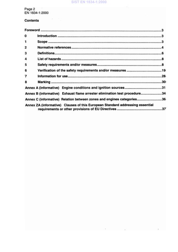 EN 1834-1:2000 (CEN) specifies safety requirements for the design and construction of reciprocating internal combustion compression ignition engines intended for use in potentially explosive atmospheres containing flammable gas and vapour. The standard applies to Group II engines in categories 2 and 3, and focuses on measures to remove hazards and limit risks associated with engine use in such atmospheres. Note: this part does not apply to atmospheres containing carbon disulphide (CS2).