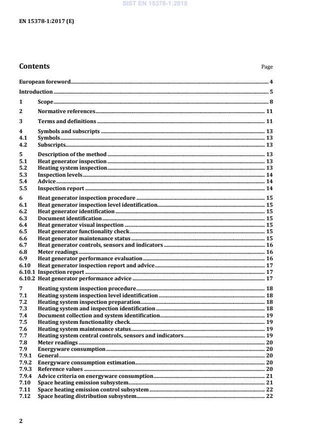 and heating systems; — there are currently significant differences among EU Member States with respect to: — heating systems typologies; — legal and/or standard requirements; — maintenance and inspection practices. Alternative and/or optional partial inspection procedures and measurement methods for heat generators and heating system parts are described in the accompanying Technical Report. Inclusion/omission/alternatives of individual inspection items as well as border lines between levels are specified through tables compiled according to the template given in normative Annex A. If no specific national specification is available, a default specification of inspection levels is given in informative Annex B. Specifications given nationally may refer either to methodologies given in the SIST EN 15378-1:2018