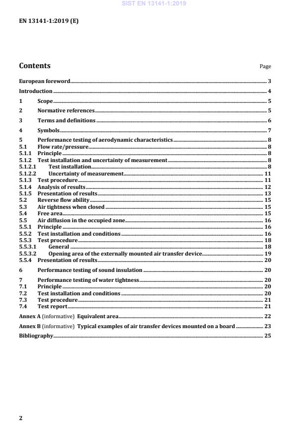 Ta evropski standard določa laboratorijske metode za testiranje zunanje in notranje vgrajenih zračnih prenosnikov, ki delujejo pri različnih tlakih. Uporablja se za naslednje vrste naprav, ki se nahajajo med dvema prostoroma (med notranjim prostorom in zunanjostjo ali med dvema sobama): – naprave z eno ali več fiksnimi odprtinami; – naprave z eno ali več ročno nastavljivimi odprtinami; – naprave z eno ali več odprtinami, ki se upravljajo z razliko v tlaku; – odprtine v oknu, posebno oblikovane kot zračni prenosniki. Opisuje preskuse namenjene označevanju naslednjega: – stopnja pretoka/tlaka; – možnost nepovratnega toka; – zračna nepropustnost, ko je prenosnik zaprt (za zunanje vgrajene zračne prenosnike, ki se lahko zaprejo); – geometrijsko prosto območje; – difuzija zraka v bivalni coni; – zvočna izolacija; – vodotesnost. Ta standard se ne uporablja za vrednotenje: – filtracije zraka; – tveganja kondenzacije; – povzročanje hrupa.