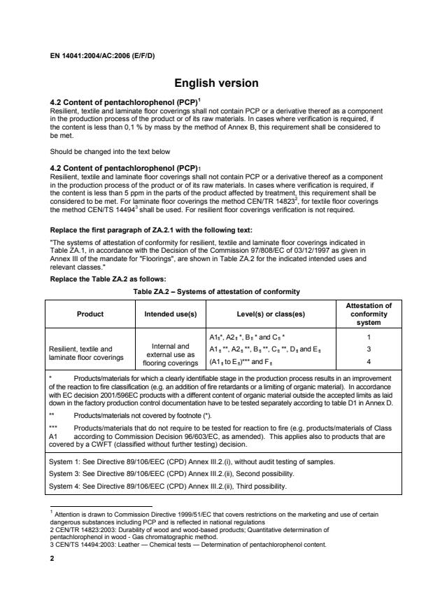 Replace the first paragraph of ZA.2.1 with the following text: "The systems of attestation of conformity for resilient, textile and laminate floor coverings indicated in Table ZA.1, in accordance with the Decision of the Commission 97/808/EC of 03/12/1997 as given in Annex III of the mandate for "Floorings", are shown in Table ZA.2 for the indicated intended uses and relevant classes." Replace the Table ZA.2 as follows: Table ZA.2 – Systems of attestation of conformity Product Intended use(s)