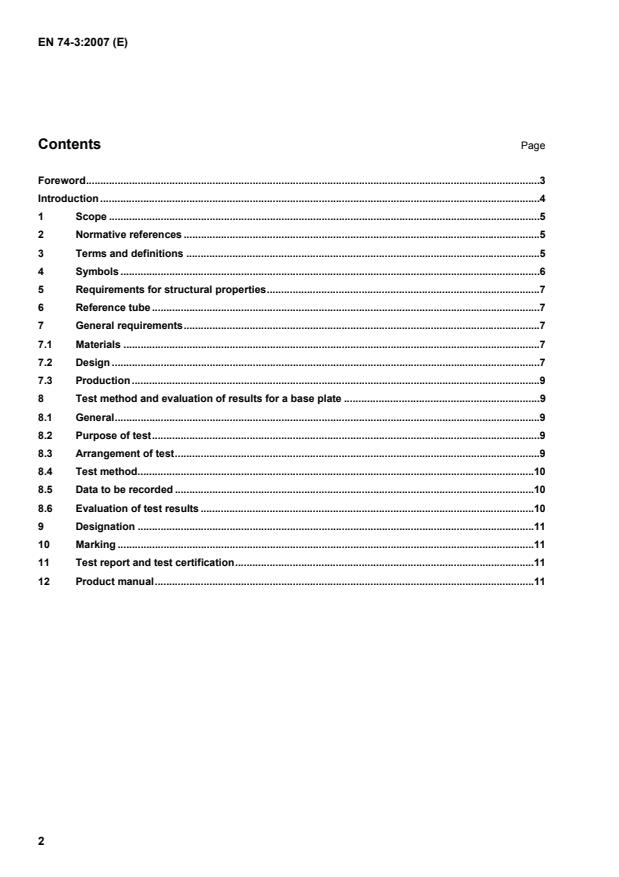 EN 74-3 specifies for non adjustable base plates and loose spigots to be used with 48,3 mm diameter tubes in scaffolds and falsework: - materials; - design requirements; - test procedure; - assessment. A base plate with a means of limited vertical adjustment, called a "base jack", is dealt with in EN 12811 1. NOTE In the text of this standard, the term "loose spigot" is used instead of the "spigot pin" in the title.