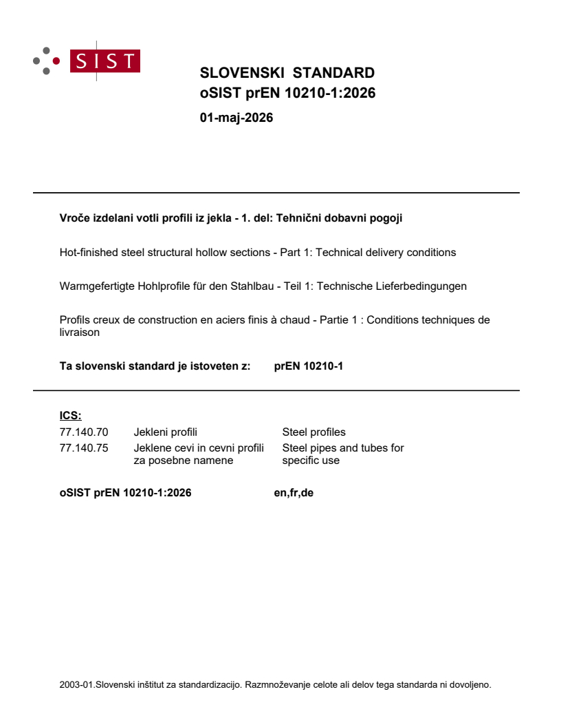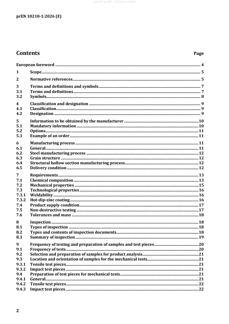 prEN 10210-1:2026 is a CEN draft European Standard that defines the technical delivery conditions for hot-finished steel structural hollow sections. This standard applies to both seamless and welded hollow sections - including those produced by electric welding and submerged arc welding. The sections may be circular, square, rectangular, or elliptical in shape. The document is intended for hollow sections formed hot, with or without subsequent heat treatment, or cold-formed and then heat treated at temperatures above 580 °C to achieve equivalent mechanical properties to hot-formed products.