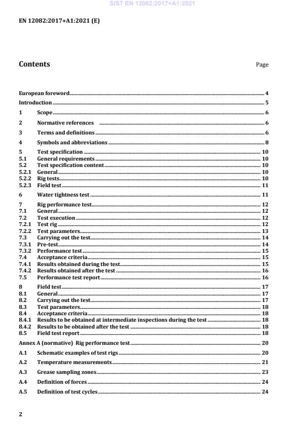 EN 12082:2017+A1:2021 is a standard published by the European Committee for Standardization (CEN). Its full title is "Railway applications - Axleboxes - Performance testing". This standard covers: This European Standard specifies the principles and methods for a rig performance test of the system of axlebox rolling bearing(s), housing, seal(s) and grease. Test parameters and minimum performance requirements for vehicles in operation on main lines are specified. Different test parameters and performance requirements may be selected for vehicles in operation on other networks (e.g. urban rail). This standard is historically developed for outboard applications but can be used for vehicles with other bearing arrangements (e.g.: inboard application or single wheels). It gives some possible examples where a "sequenced performance test" addresses the broad range of different service conditions within a specific application or vehicle platform into account. It describes in detail the water tightness test and basic principles and minimum requirements for a field test. This European Standard only applies to axleboxes equipped with rolling bearings and greases according to EN 12080 and EN 12081.