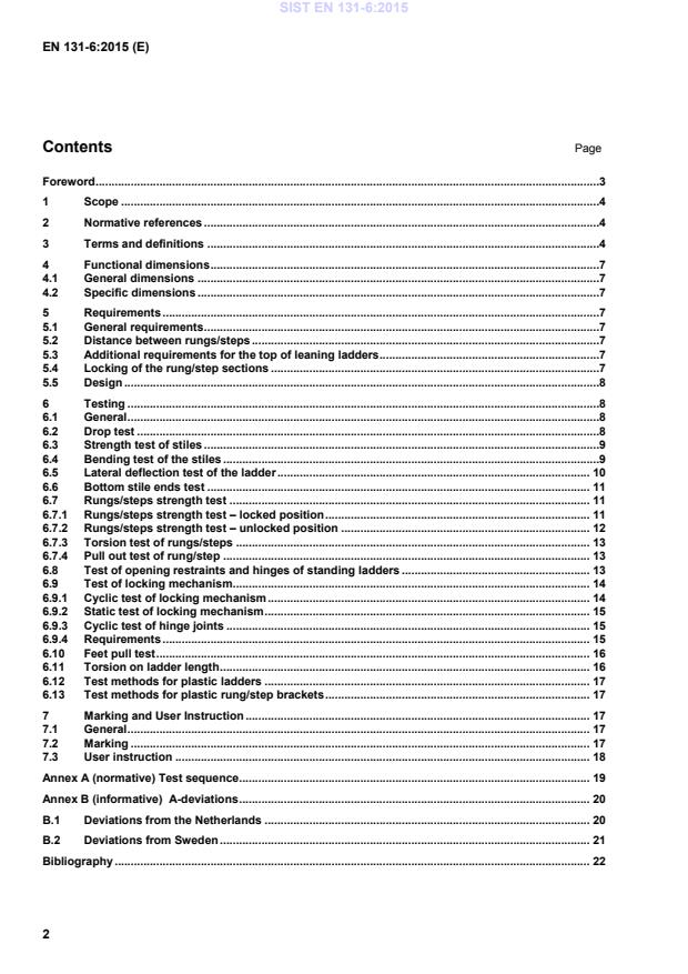Protection against squeezing can be assured by a permanent braking function of the ladder or by a special stop or distance device. If a permanent breaking function is used a typical time for collapsing a section of 300 mm is 1,5 s if the movement is uniform. If only a distance device is used for protection against squeezing between the rung/steps this device shall be located at least 80 mm from the manufacturers recommended position of the user´s hands during collapse of the ladder. 6 Testing 6.1 General For all tests, unless otherwise stated in the particular test, the following tolerances apply: ± 1 mm for longitudinal measurements; ± 5 mm for the measurement of the distance between the supports and the overhanging length; ± 1° for the measurement of angles; ± 1 % for static forces and torque. Tests shall be performed at a temperature between 15° C and 25° C. Where the ascendable side cannot be determined by the construction of the product, or where it is a multiple part combination ladder, the ladder shall be tested twice regarding 6.3 and 6.4. Conduct strength test and bending test on one side then rotate the ladder 180° about the longitudinal axis and repeat 6.3 and 6.4. Inspect the ladder before testing to confirm condition and operation of all parts by fully extend the ladder. Perform drop test according to 6.2 as preconditioning for each ladder, with the exception of test block D (bottom stile end test) and F (feet pull test), see Annex A. 6.2 Drop test Place the extended ladder in vertical position. Let the ladder fall in the direction of use from vertical to horizontal position by its own weight. Repeat the test with ladder rotated 180° about the longitudinal axis. SIST EN 131-6:2015