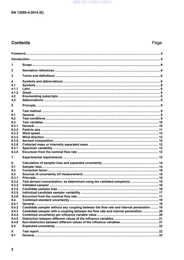 Introduction . 5 1 Scope . 6 2 Normative references . 6 3 Terms and definitions . 6 4 Symbols and abbreviations . 6 4.1 Symbols . 6 4.1.1 Latin . 6 4.1.2 Greek . 8 4.2 Enumerating subscripts . 8 4.3 Abbreviations . 8 5 Principle . 9 6 Test method . 9 6.1 General . 9 6.2 Test conditions . 9 6.3 Test variables . 10 6.3.1 General . 10 6.3.2 Particle size . 11 6.3.3 Wind speed . 12 6.3.4 Wind direction . 12 6.3.5 Aerosol composition . 12 6.3.6 Collected mass or internally separated mass . 12 6.3.7 Specimen variability . 12 6.3.8 Excursion from the nominal flow rate . 12 7 Experimental requirements . 13 8 Calculation of sampler bias and expanded uncertainty . 14 8.1 Sampler bias . 14 8.2 Correction factor . 15 8.3 Sources of uncertainty (of measurement) . 15 8.3.1 Principle . 15 8.3.2 Test aerosol concentration, as determined using the validated sampler(s) . 15 8.3.3 Validated sampler . 16 8.3.4 Candidate sampler bias . 16 8.3.5 Individual candidate sampler variability . 17 8.3.6 Excursion from the nominal flow rate . 17 8.4 Combined standard uncertainty . 19 8.4.1 General . 19 8.4.2 Candidate sampler without any coupling between the flow rate and internal penetration . 19 8.4.3 Candidate sampler with a coupling between the flow rate and internal penetration . 20 8.4.4 Combined uncertainty per influence variable value . 20 8.4.5 Distinction between different values of the influence variables . 21 8.4.6 Non-distinction between different values of the influence variables . 21 8.5 Expanded uncertainty . 22 9 Test report . 22 9.1 General . 22 SIST EN 13205-4:2014