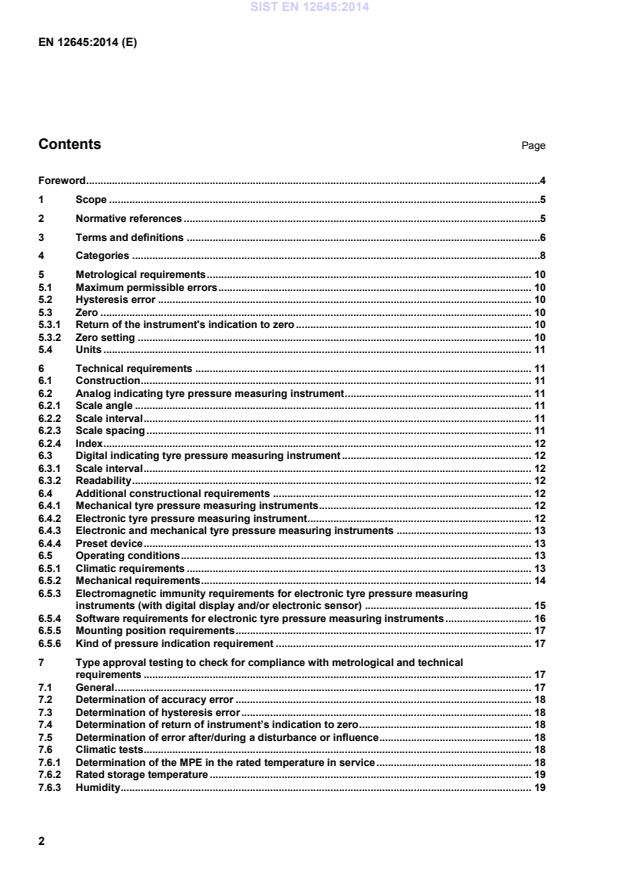 in bar Maximum permissible errors (MPE) ± in bar Ambient temperature (tamb) in °C for tyre pressure measuring instruments below 15 °C from 15°C to 25 °C above 25 °C ≤ 4 0,005 * (15 - tamb) + 0,08 0,08 0,005 * (tamb - 25) + 0,08 > 4 to ≤ 10 0,005 * (15 - tamb) + 0,16 0,16 0,005 * (tamb - 25) + 0,16 > 10 0,005 * (15 - tamb) + 0,25 0,25 0,005 *(tamb - 25) + 0,25 A graphical representation of these two tables is provided in Annex B. 5.2 Hysteresis error Hysteresis error of tyre pressure measuring instruments shall not exceed the absolute value of the maximum permissible error, given in 5.1 in the column “from 15 °C to 25 °C”. 5.3 Zero 5.3.1 Return of the instrument's indication to zero If the instrument indicates zero, the ‘real’ indication shall be within MPE or the instrument shall not indicate values below the minimum value of measured pressure. At atmospheric pressure, the index shall stop at the zero mark or at a predetermined mark clearly differentiated from the scale intervals, within the limits of the maximum permissible error. 5.3.2 Zero setting An instrument may be equipped with an automatic or semi-automatic zero-setting device. The semi-automatic zero-setting device has to check being at the atmospheric pressure before setting to zero. Manual zero-setting is not allowed except by switching OFF and ON. NOTE Manual means the operator can influence the result. SIST EN 12645:2014