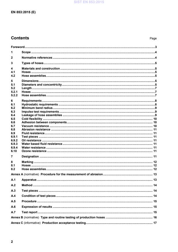 EN 853:2015 is a standard published by the European Committee for Standardization (CEN). Its full title is "Rubber hoses and hose assemblies - Wire braid reinforced hydraulic type - Specification". This standard covers: This European Standard specifies requirements for four types of wire braid reinforced hoses and hose assemblies of nominal bore from 5 to 51. They are suitable for use with: - hydraulic fluids in accordance with ISO 6743 4 with the exception of HFD R, HFD S and HFD T at temperatures ranging from -40 °C to +100 °C; - water based fluids at temperatures ranging from -40 °C to +70 °C; - water at temperatures ranging from 0 °C to +70 °C. This European Standard does not include requirements for end fittings. It is limited to the performance of hoses and hose assemblies. NOTE 1 The hoses are not suitable for use with castor oil based and ester based fluids. NOTE 2 Hoses and hose assemblies are not be operated outside the limits of this standard. NOTE 3 Requirements for hydraulic hoses for underground mining are standardized in separate standards.