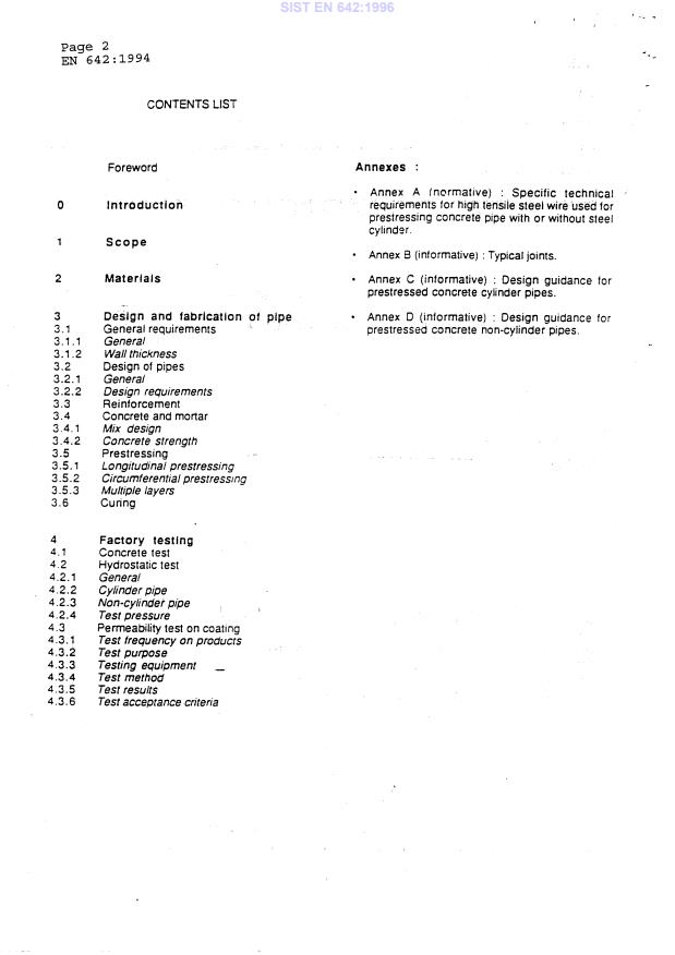 EN 642:1994 is a standard published by the European Committee for Standardization (CEN). Its full title is "Prestressed concrete pressure pipes, cylinder and non-cylinder, including joints, fittings and specific requirements for prestressing steel for pipes". This standard covers: This standard covers the requirements and the manufacture of prestressed concrete cylinder pressure pipes and fittings in sizes from DN/ID 500 to DN/ID 4000 inclusive. Larger sizes could be manufactured based on the concepts of thisstandard. These types of pipes are designed for the internal pressure, external loads and bedding conditions designated by the purchaser.