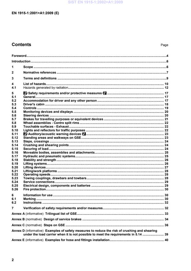 3.6 walkway area on GSE intended to be used by persons moving from one place to another 3.7 stabilizer support used to maintain and/or increase the stability and capable of supporting and/or levelling the GSE 3.8 friction-type safeguard safety equipment which restricts or prevents movement of parts in relation to each other by the use of frictional forces e.g. brakes, safety gears 3.9 instructions documents supplied by the manufacturer or supplier describing the intended use of the GSE and containing information for safe operation, installation, transport and maintenance 3.10 operational use activities, effects, processes or movements that result from intended use of the GSE 3.11 unintentional movement any movement without operator's conscious intent e.g. caused by failure of the GSE 3.12 unit load device (ULD) assembly of components comprising one of either e.g. an aircraft pallet and pallet net, an aircraft pallet, a container with integral pallet or an aircraft container 4 List of hazards This list is based on EN 1050:1996 and contains the hazards and hazardous situations, as far as they are dealt with in this European Standard, identified by risk assessment as significant for this type of machinery and which require action to eliminate or reduce risks. !See also the complementary list of hazards in the other parts of EN 1915 and in the different parts of EN 12312." SIST EN 1915-1:2002+A1:2009