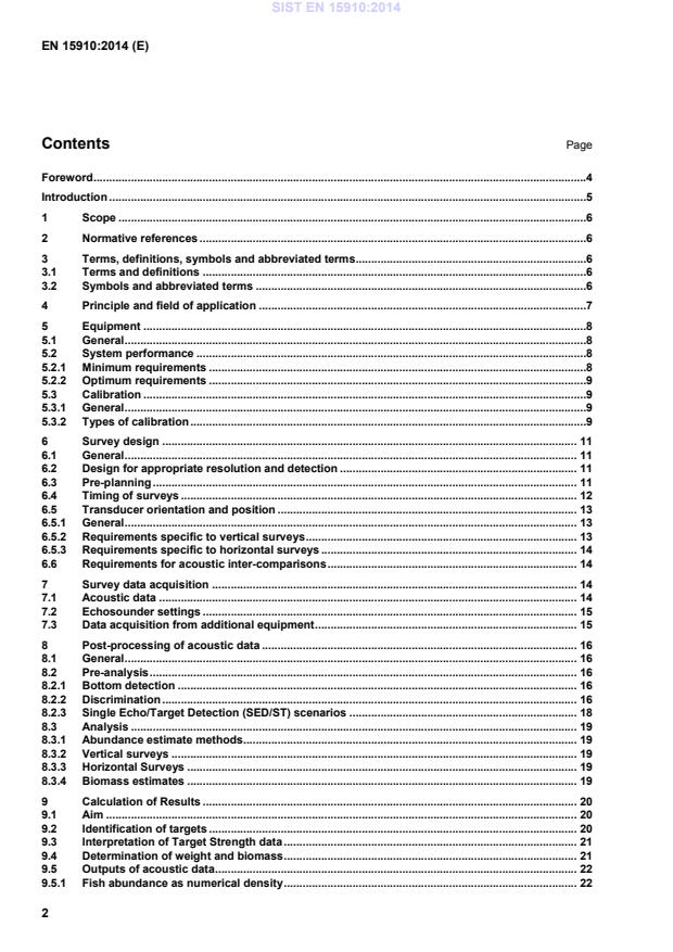 m-2); — Sv Volume Backscattering Strength; Unit: decibel, dB re 1 m-1; — SED Single Echo Detection; — SNR Signal to Noise Ratio; — ST Single Target; — TS Target Strength; Units = dB re 1m2; — TVG Time Varied Gain; — YOY Young of the year. SIST EN 15910:2014