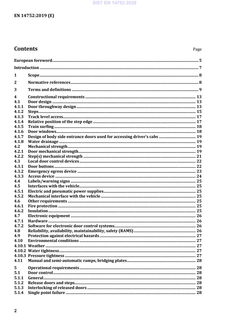 EN 14752:2019 is a standard published by the European Committee for Standardization (CEN). Its full title is "Railway applications - Bodyside entrance systems for rolling stock". This standard covers: This document applies to passenger body side entrance systems of all newly designed railway vehicles such as tram, metro, suburban, mainline and high-speed trains that carry passengers. The requirements of this document also apply to existing vehicles undergoing refurbishment of the door equipment, as far as it is reasonably practicable. This document also specifies the requirements for testing of entrance systems. This document makes reference to manual and power operated entrance systems. For manual doors, clauses referring to power operation are not applicable. This document does not apply to the following: - entrance systems for equipment access, inspection or maintenance purposes and for crew only use; - doors on freight wagons; and - doors or hatches specifically provided for escape under emergency conditions.